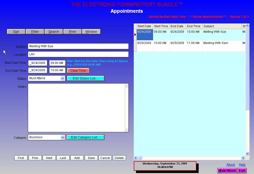In The Electronic Form/Report Bundle™ you will find: 1. A Contact Database 2. An Appointment Tracker 3. An Electronic Things-To-Do List 4. Dozens of ready-to-use forms and letters 5. An Invoicing Module 6. A Simple Loan Calculator 7. A special section on tips for writing winning classified ads 8. Dozens of computer and business related reports 9. Twelve business ideas you can do from home |